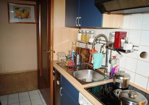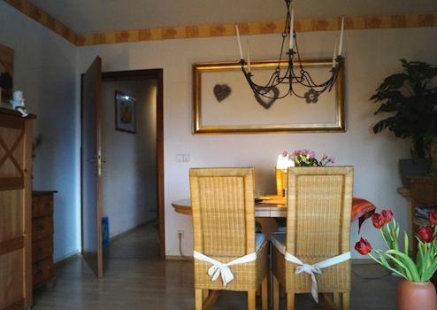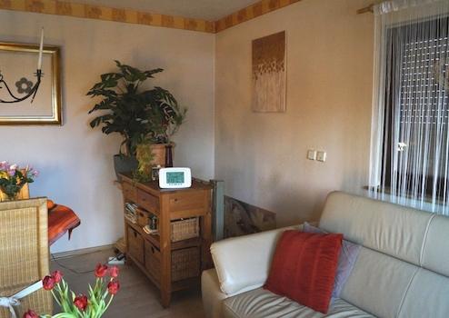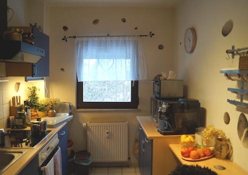 Die Fußbodengestaltung wechselt zwischen Laminat im Wohnbereich sowie Fliesenbelag im Küchen- und Sanitärbereich.