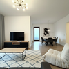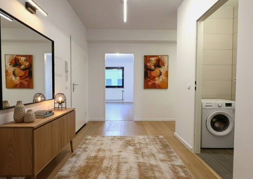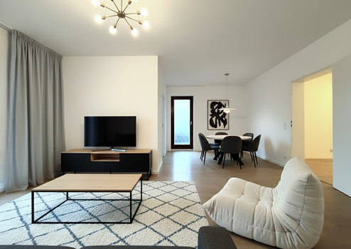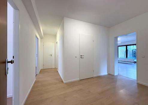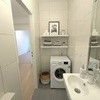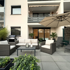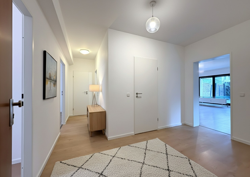 Das Bad ist mit einer Duschkabine mit Regendusche und Massagedüsen, sowie einer großen Badewanne ausgestattet und wird ergänzt durch ein zusätzliches Gästebad, welches Platz für eine Waschmaschine bietet. Zur rechten Seite befindet sich der geräumige Wohnbereich, der den Zugang zur großzügigen, zum ruhigen Innenhof nach Süden ausgerichteten Terrasse, sowie zur Küche ermöglicht. Hier lässt es sich wunderbar vom Alltagsstress erholen.