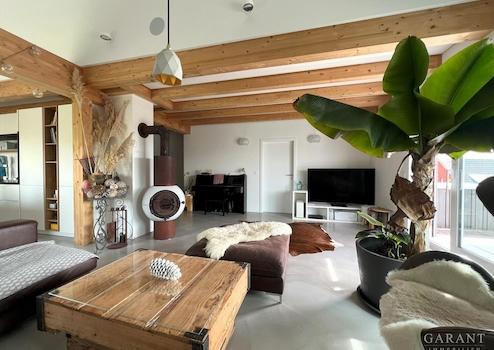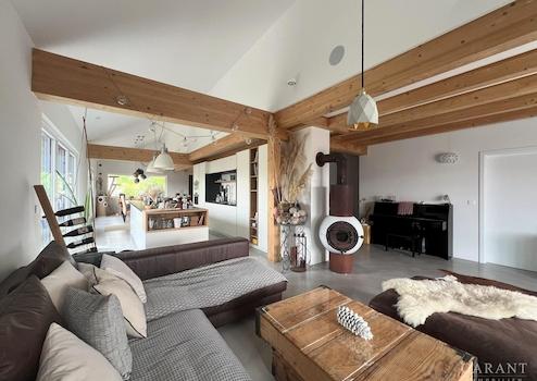 Der Wohnraum ist geprägt durch klare Linien, hochwertige Materialien und ein behagliches Ambiente - unterstrichen durch den modernen Kaminofen, der für Wärme und Atmosphäre sorgt.