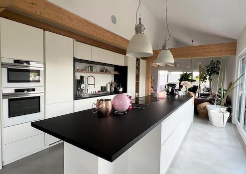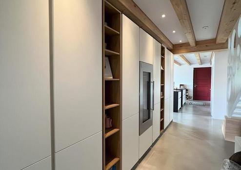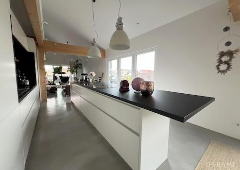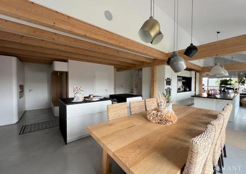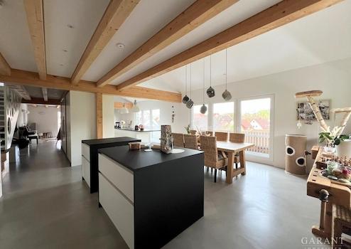 Das Herzstück bildet der offene Wohn- und Essbereich mit einer exklusiven Einbauküche, ausgestattet mit hochwertigen Geräten, einem integrierten Weinschrank und edlen Oberflächen.