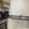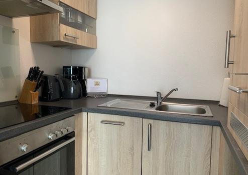 Küche mit Cerankochfeldern und Backofen; Mikrowelle; Kühlschrank; Geschirrspülgerät;