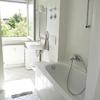 Dusche und Badewanne. Große Fenster sorgen für viel Licht und