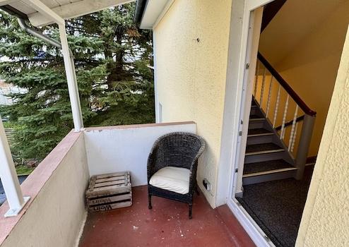 Ein zur Wohnung gehörender, überdachter Balkon ist vom Treppenhaus aus erreichbar. Ergänzend stehen ein geräumiger Kellerraum, eine gemeinschaftliche Waschküche mit Anschlüssen für Waschmaschine und Trockner sowie ein PKW-Stellplatz auf dem Grundstück zur Verfügung.