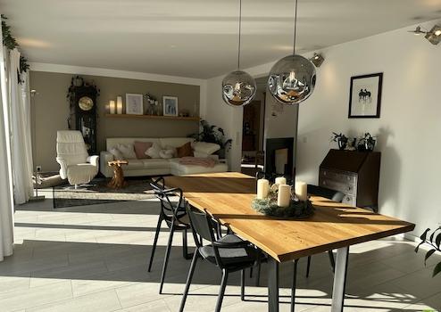 Bei der Gestaltung der Innenräume lag der Fokus auf einer harmonischen Verbindung aus Gemütlichkeit und modernem Wohnstil. Helle, freundliche Räume schaffen eine Atmosphäre, die gleichermaßen Offenheit und Geborgenheit vermittelt.