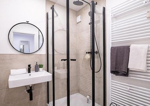 • Bodenbelege: Modernes Laminat und hellbraune Fliesen