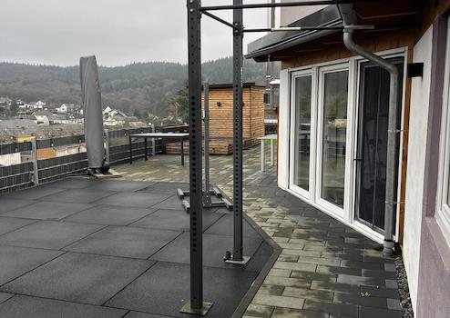 Vielfältige Nutzung: Die Außenfläche lädt ein zu einem Outdoor-Gym oder einem Kinderspielplatz, dank Fallschutzmatten.