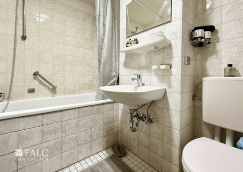 Das Badezimmer ist klassisch gefliest und mit einer Badewanne ausgestattet. Es präsentiert sich in gepflegtem Zustand und bietet zugleich Potenzial für eine Modernisierung hin zu einem zeitgemäßen Wohlfühlbad.
