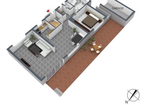 Nachdem Sie entspannt in Ihrer Garage geparkt haben, stehen Sie nach wenigen Stufen in Ihrem neuen Zuhause. Ihre Einkäufe bringen Sie in die Küche, die über eine Einbauküche verfügt. Dort können Sie ein wunderbares Abendmahl zubereiten und dieses im Essbereich vor der Küche servieren. Auch die Westterrasse bietet sich an, auf der Sie ein Glas Wein in der Abendsonne genießen können. Gemütlichen Abenden auf der Couch steht im geräumigen Wohnbereich nichts im Wege. Sollten Sie trotzdem noch von der Arbeit gestresst sein, können Sie in der Badewanne oder unter der Dusche die Seele baumeln lassen. Das Schlafzimmer bietet ausreichend Platz für ein großes Bett und einen Kleiderschrank.