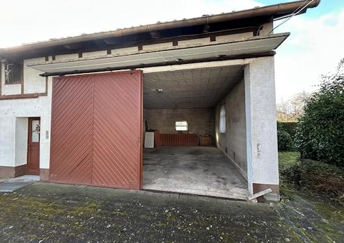 Das Nebengebäude mit der großen Garage bietet z. B. für ein Wohnmobil einen trockenen Stellplatz oder kann anderweitig genutzt werden.