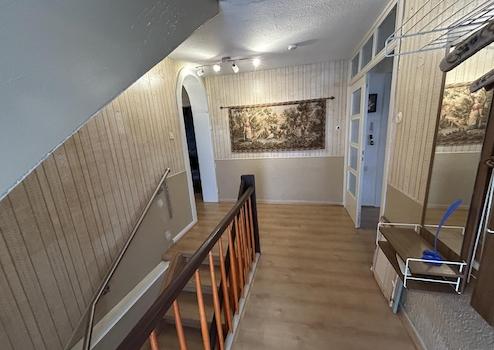 Im Obergeschoss befinden sich auf der rechten Seite des Flurs das kleine Bad mit Dusche, Wanne und WC, die große Küche, welche im Preis enthalten ist, mit gemütlicher Eckbank und Esstisch und das großzügige Wohn-Esszimmer, mit großer Fensterfront und einem optischen Kamin.