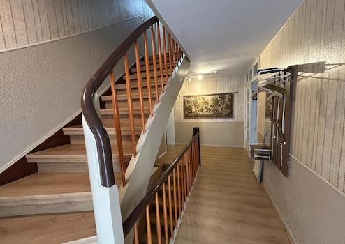 Über eine massive Holztreppe gelangt man in die Wohnräume im Obergeschoss und Dachgeschoss.