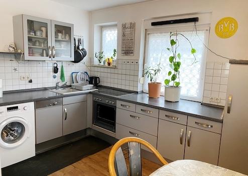- Einbauküche mit Großgeräten (Backofentür defekt) sowie Waschmaschinenanschluss incl. der Waschmaschine