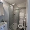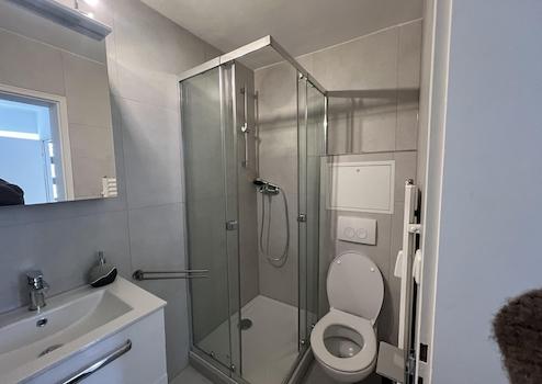 Das Badezimmer ist neu renoviert und verfügt über eine moderne Dusche, Waschbecken und WC.