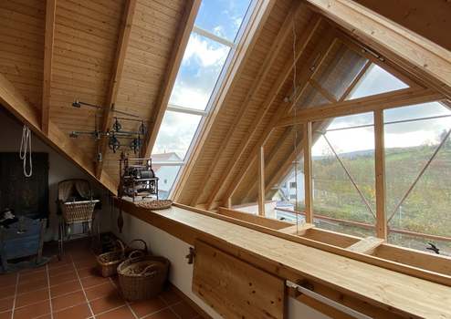 Dieses imposante Wohnhaus befindet sich in exklusiver, absolut ruhiger Wohnlage am Ortsrand mit Blick ins Grüne. Das Erdgeschoss mit großzügiger Diele, einem Zimmer, Gäste-WC, praktischem Hauswirtschaftsraum, Küche, Esszimmer und Wohnzimmer wurde durch einen hellen, lichtdurchfluteten Wintergarten erweitert. Dies war und wird immer der Wohnmittelpunkt sein. Denn hier gibt's nicht nur Platz für die große Familie, sondern auch einen traumhaften Ausblick gratis. Die große Fensterfront lässt die Sonne herein und die offene Deckenkonstruktion bietet ein luftiges Raumgefühl, während der Kaminofen in den Übergangs- und Wintermonaten für mollige Wärme sorgt. Im Dachgeschoss dann die Galerie mit Blick in den Wintergarten. Hier lässt es sich gut arbeiten - der ideale Platz z.B. für Homeoffice. Auch hier genießen Sie den herrlichen Ausblick in die Natur. Weiter gibt es in dieser Etage ein großes Kinderzimmer, das durch Einziehen einer Trockenbauwand in zwei schöne, nahezu gleich große Kinderzimmer umgewandelt werden kann. Außerdem findet man hier ein Schlafzimmer, Bad, WC und einen weiteren Raum sowie Platz im Vorraum, ideal als Abstellfläche oder als Spielbereich für die Kleinen.