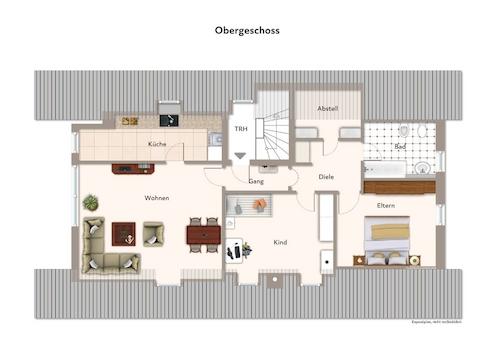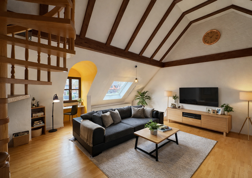 Die Obergeschosswohnung bietet eine helle, gut strukturierte Wohnfläche mit einer einladenden Galerie, die sich ideal als Arbeits- oder Ruhebereich eignet. Ergänzt wird diese Ebene durch ein weiteres Zimmer sowie einen praktischen Abstellraum im Dachbereich, der zusätzlichen Stauraum schafft.