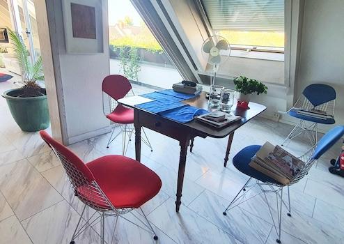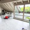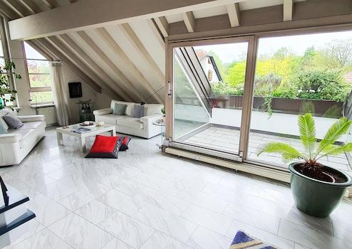 1. DG: Sehr großzügiger, lichtdurchfluteter Wohn-/Essbereich mit schöner West-Dachterrasse, offener Diele und Durchgang zum Kinder-/Arbeitszimmer, Küche und Schlafzimmer mit Ausgang auf den großen Südbalkon, Tageslicht-Bad mit Badewanne, Dusche, 2 Waschbecken und WC, separates Gäste-WC, Treppe ins