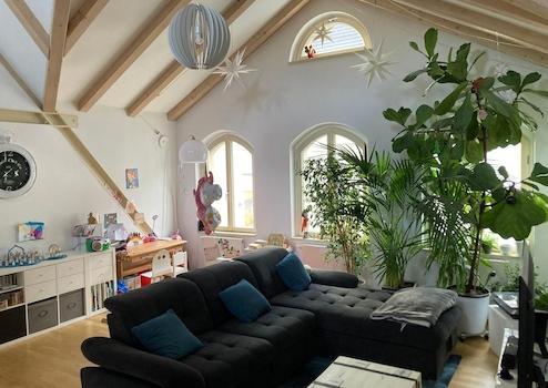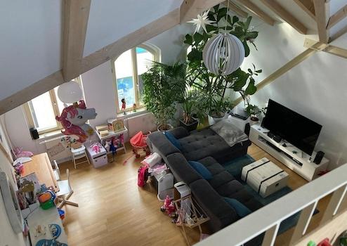 schön und voll saniertes Bürgerhaus mit großem begrünten Innenhof und eigenen Stellplätzen großzügige Dachgeschosswohnung mit Galerie Ebene und zwei Dachterrassen mit weitem Blick