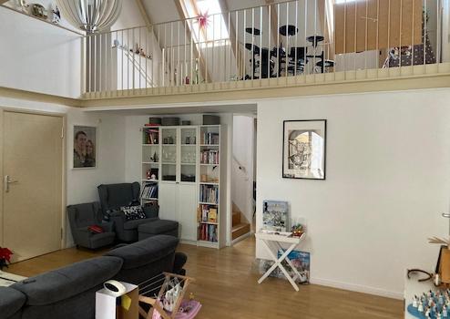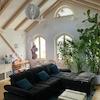 Das große offene Wohnzimmer reicht bis in den Dachfirst.