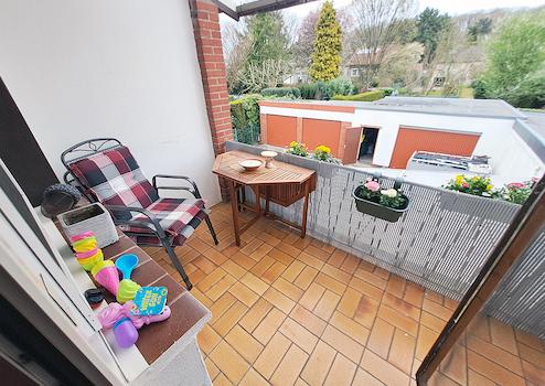 Dachgeschoss (ca. 27 m²): Wohnzimmer (mit Küchenzeile und Balkonzugang), Schlafzimmer, Diele, Bad