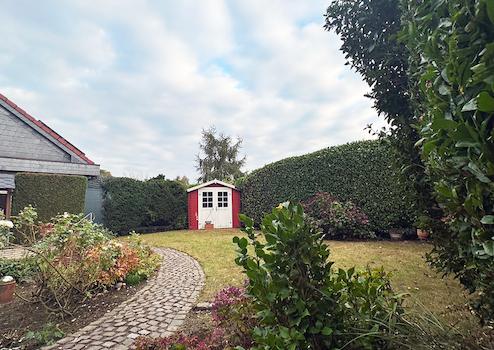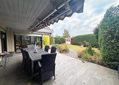 Der liebevoll angelegte Garten lädt zum Spielen und Toben bzw. zum Relaxen auf der teilüberdachten Südterrasse ein.