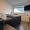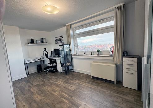 Wohnzimmer mit Dachterrassenzugang und angrenzender offener Küche (mit Sitzgelegenheit), Schlafzimmer, Büro (respektive Kinderzimmer), Flur, Bad, Gäste-WC