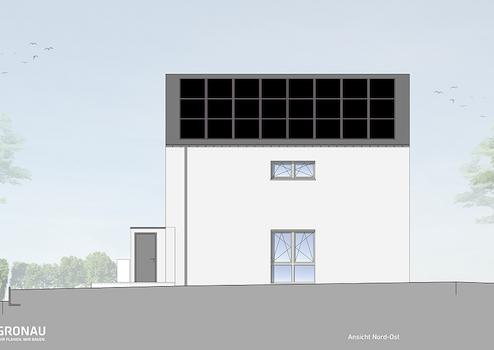 Erdgeschoss: Wohn- und Esszimmer mit angrenzender offener Küche, Büro, Flur (mit Garderobenbereich), Gäste-WC, Abstell- und Technikraum, Hauswirtschaftsraum und Terrasse