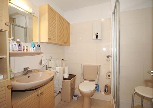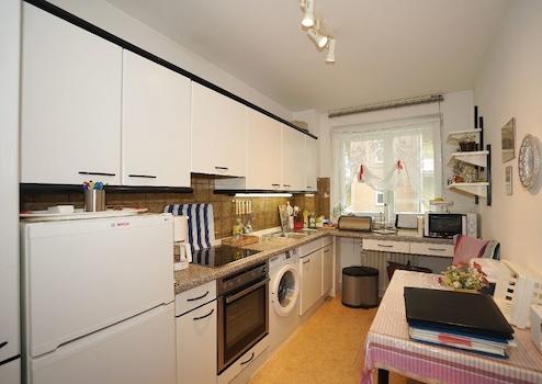 Die Küche bietet ausreichend Platz für alle erforderlichen Einrichtungen und darüber hinaus die Möglichkeit, einen Frühstücksplatz zu integrieren. Die vorhandenen Kücheneinbauten verbleiben inklusive eventueller Elektrogeräte in der Wohnung. Insgesamt besteht die Möglichkeit, dass in der Wohnung noch vorhandene Mobiliar bei Bedarf und nach Absprache mit der Verkäuferin zu übernehmen. Das Badezimmer ist mit Waschtisch, WC und Dusche ausgestattet. Darüber hinaus sind die Anschlüsse für Waschmaschine und Trockner vorhanden.