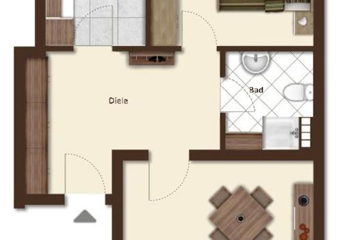 Nachdem Sie die Wohnung betreten haben, befinden Sie sich in einer geräumigen Eingangsdiele, die neben einer Garderobenecke auch über einen großzügigen Einbauschrank verfügt. Hier ist u. a. der Sicherungskasten untergebracht. Von hier aus sind alle anderen Räume der Wohnung erreichbar.