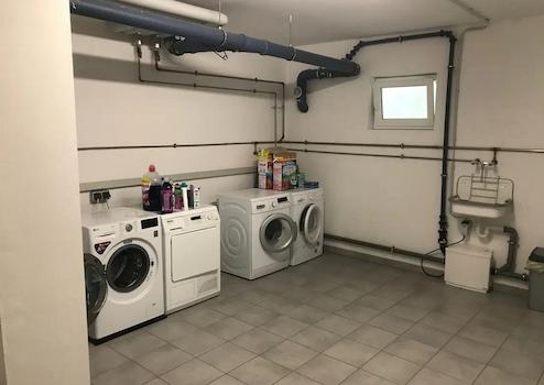 Zudem gibt es einen Waschraum mit eigenem Platz und Wasseranschluss für die Waschmaschine im