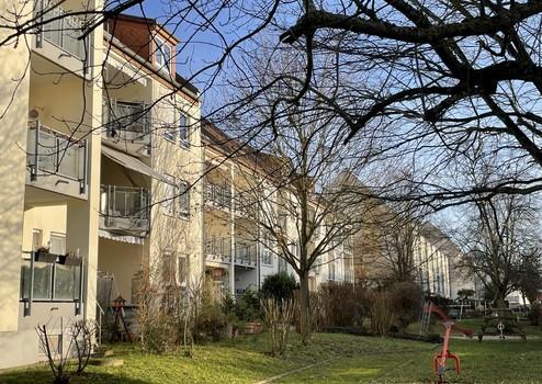 Zur Eigentumswohnanlage gehört eine Gartenanlage mit Kinderspielplatz.