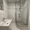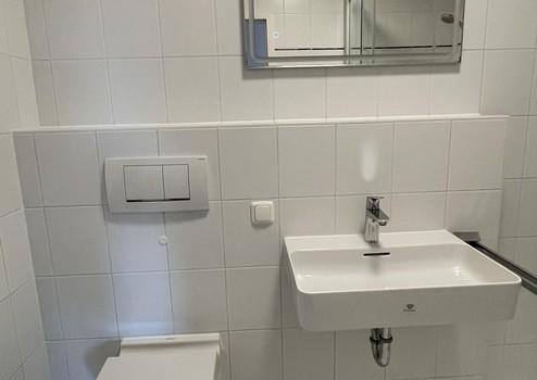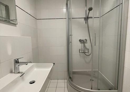 Das Badezimmer bietet einen modernen Waschtisch, ein Wandhänge-WC und eine geräumige, halbrunde Eck-Dusche (90x90 cm) mit Glasabtrennung, raumhohe weiße Fliesen und einen Flachheizkörper. Das Bad ist innenliegend mit einer Entlüftung über mechanische Luftabsaugung.