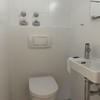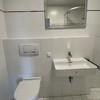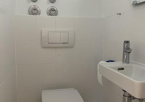 Das Gäste-WC verfügt über ein modernes Handwaschbecken und ein Wandhänge-WC, weiße Fliesen und ist ebenfalls innenliegend mit Entlüftungsanlage.