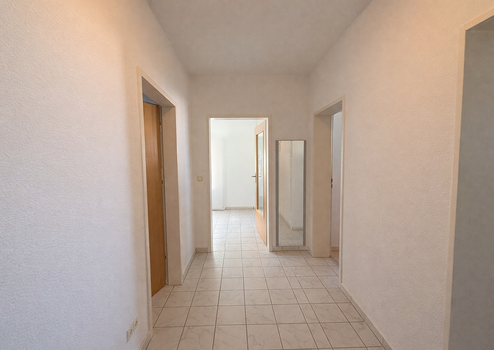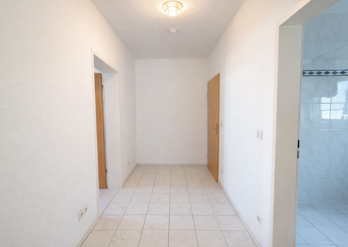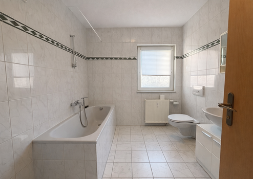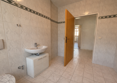 Das Badezimmer verfügt über eine Badewanne, ein Waschbecken, ein WC sowie einen Waschmaschinenanschluss. Ein großer geräumiger Flur rundet das Platzangebot ab.