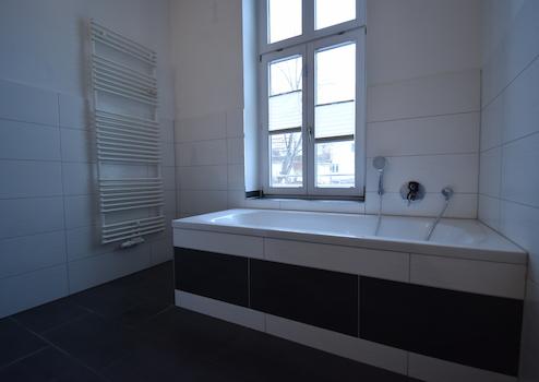 Hochparterre, Flur, Bad mit Wanne, Dusche, WC, Handwaschbecken und Fenster, Schlafzimmer, Küche mit Fenster, Einbauküche, Wohnzimmer und Kinderzimmer