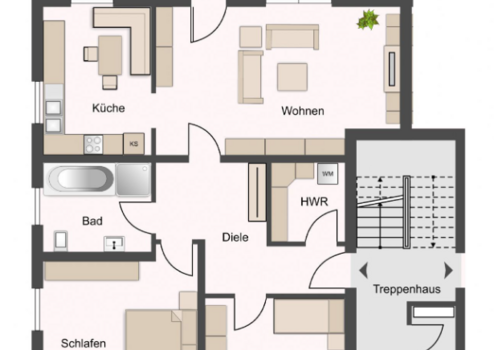 Das helle Tageslichtbad ist mit Badewanne und Dusche ausgestattet und bietet so maximalen Komfort. Ein praktischer Hauswirtschaftsraum schafft zusätzlichen Stauraum und Platz für Waschmaschine und Trockner.