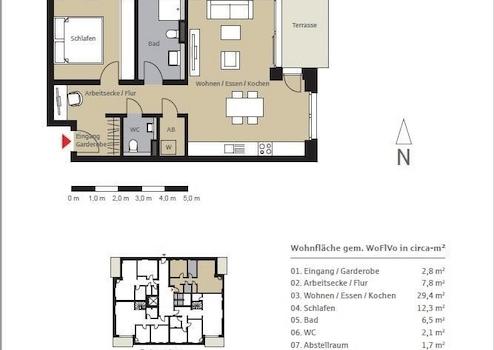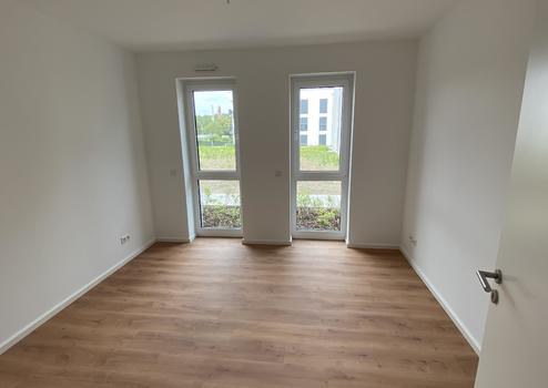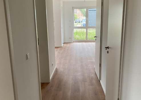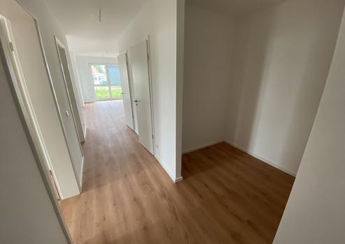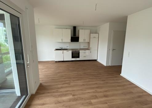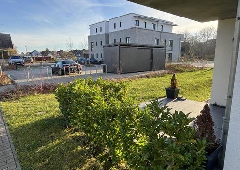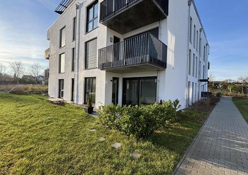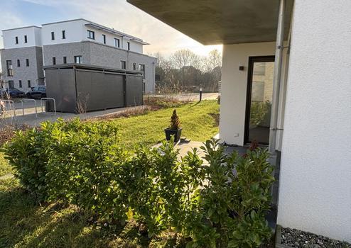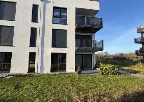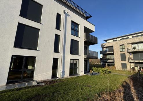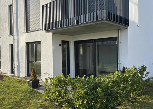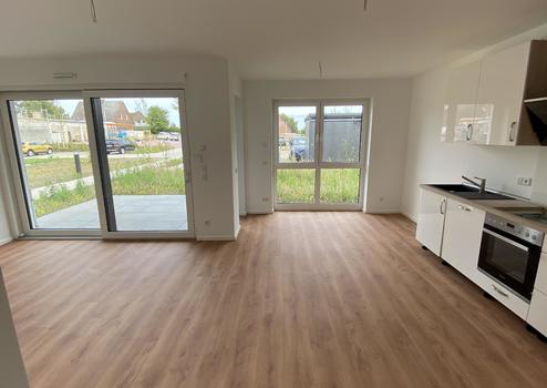 Die Erdgeschoss-Wohnung verfügt über ein großzügiges Wohnzimmer mit offener Küche, Zugang zur überdachten Terrasse & Gartenteil, 1 Schlafzimmer, Duschbad mit ebenerdiger Dusche, Gäste-WC, Abstellraum.