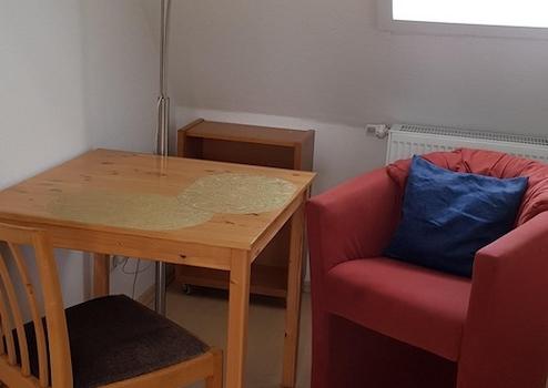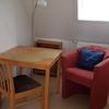Kleines und sehr gemütliches Zimmer mit modernem Laminatfußboden, in dem Wohnraum befinden sich ein Sessel, ein Eßzimmertisch mit 1 Stuhl,