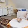 Wohnraum mit Tisch, Stuhl, Bett 100x200 cm, Kleiderschrank, Couch, Sessel,