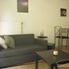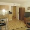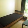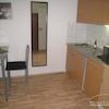 Wohn / Schlafraum mit Bett 1m, Nachttisch,kleine Couch mit Couchtisch, Hocker, TV, Kleiderschrank, Tisch mit 2 Hockern, Laminat.