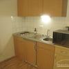 Pantryküche komplett eingerichtet mit Spüle, Herd mit 2 Kochplatten, Kühlschrank und Kaffeemaschine.