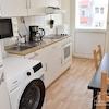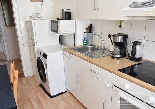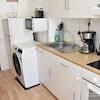 Einbauküche, komplett ausgestattet mit Waschmaschine, Tisch mit 2 Stühlen, Gefrier-/Kühlschrank, Herd, Ofen, Mikrowelle, Zugang zum