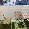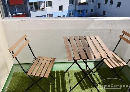 Balkon mit Tisch und 2 Stühlen.