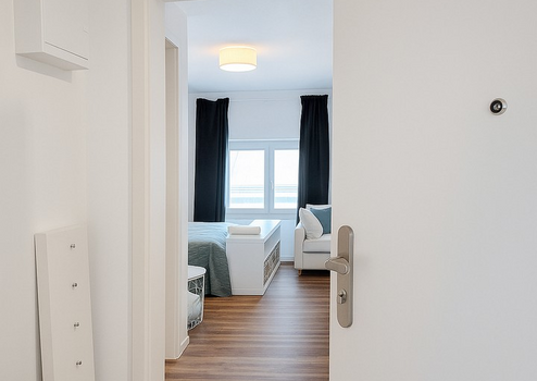 Das Apartment ist vollständig möbliert – geschmackvoll, modern und funktional. Vom gemütlichen Bett über einen stilvollen Essplatz bis zur clever integrierten Stauraumlösung ist alles vorhanden, was das urbane Leben angenehm macht.