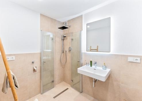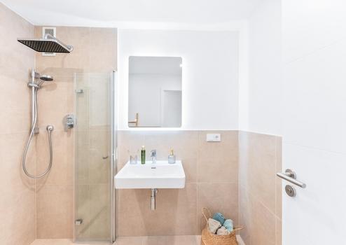 - Bodengleiche Dusche mit Glasabtrennung und Regendusche