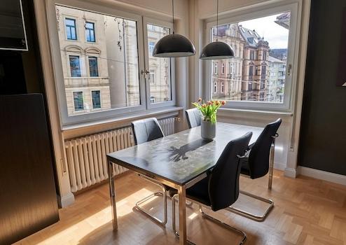 - Ausblick auf die Alexanderstraße (denkmalgeschützte Gebäude) aus Schlafzimmer, Küche und Essbereich