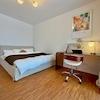 Das 1. Zimmer rechts umfasst 22,30 m² Sondermietfläche sowie 12,9 m² anteilige Mietfläche an der Gemeinschaftsfläche. Das Zimmer besticht durch seine Helligkeit. Bodentiefe Fenster verbinden das großzügige Schlafzimmer über eine Terrassentür mit dem exklusiven Balkon über 8,6 m². Geöffnet zu zwei Seiten und überdacht lädt dieser zum Ausklingen warmer Sommerabende ein oder zu einem kurzen Kaffee in der Mittagszeit. Die Einrichtung ist sehr flächeneffizient gestaltet, sodass sich samt des bestehenden Inventars ein großzügiges Raumgefühl ergibt. Abgerundet wird das Wohnerlebnis durch die weitreichende Aussicht in den begrünten Hinterhof mit Spielplatz.