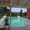 Die Poolbar hat einen Pizzaholzofen und liegt an einem kleinen Teich.