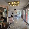 Das Haus wurde 2023/2024 neu gestylt und eingerichtet, hat teils weiße Holzvertäfelungen, kombiniert mit teuren Designertapeten. Das apricotfarbene Esszimmer mit Blick auf Pool und Garten wird von einem weißlackierten Bücherregal umsäumt. Das Wohnzimmer trägt eine goldene Samtmustertapete mit Blick durch die Rundbogenfenster auf die Westterrasse. Die Böden sind in den Bädern Antikmarmor, in den Wohnräumen teils Zementfliesen mit wunderschönen Mustern.