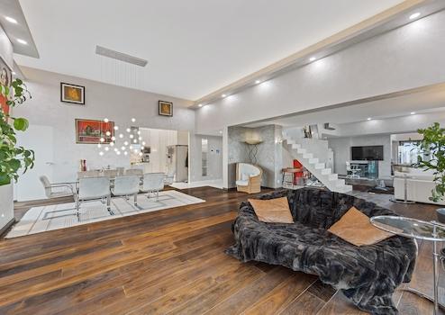 Der ca. 120 m² große Wohn-Ess-Chillbereich mit dem spektakulären Glasbalkon und grossem Kamin - besticht in Verbindung mit der beachtlichen Raumhöhe von bis zu 4,50 Metern, den bodentiefen riesigen Fensterfronten mit spektakulärer Aussicht, sowie der Süd-West-Ausrichtung, durch ein absolut helles Ambiente und eine faszinierende Wohnatmosphäre.