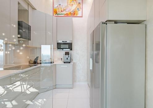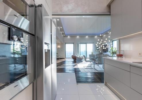 - Küche und Flur – sehr exclusive grossformatige hochweisse Glasfliesen